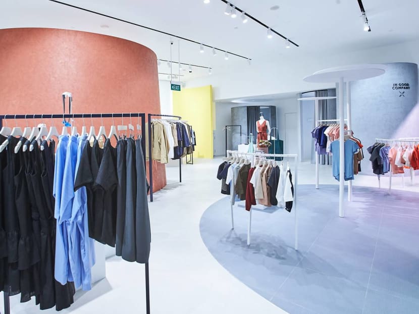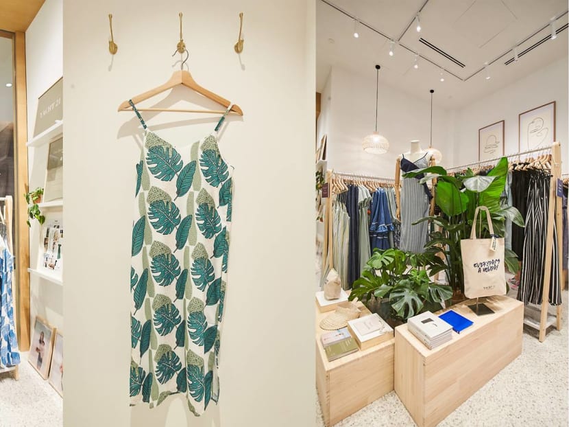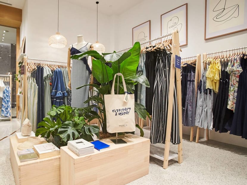 Taking the idea that her latest store is located at the airport and how that's a gateway for vacations, homegrown urban resort wear label Yacht 21 founder Jarenis Ho's new flagship store in Jewel isn't a duplex or the biggest anything, but that's okay. Instead, the open-concept store aims to bring a slice of resort life into the building, with natural oak and vintage rattan finishing and travel-inspired drawings.