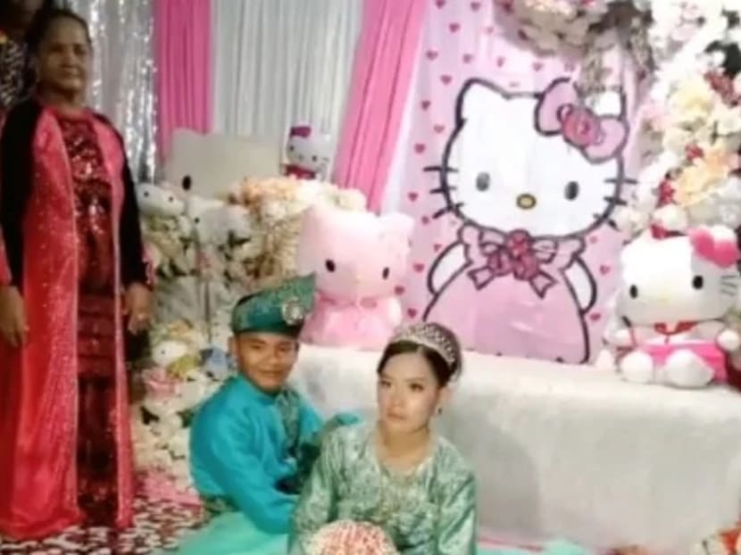 What caught the netizens’ attention was the couple’s matching Hello Kitty outfits, which included three wedding gowns and baju melayu, all made with pink and blue fabrics featuring the mouthless cat.