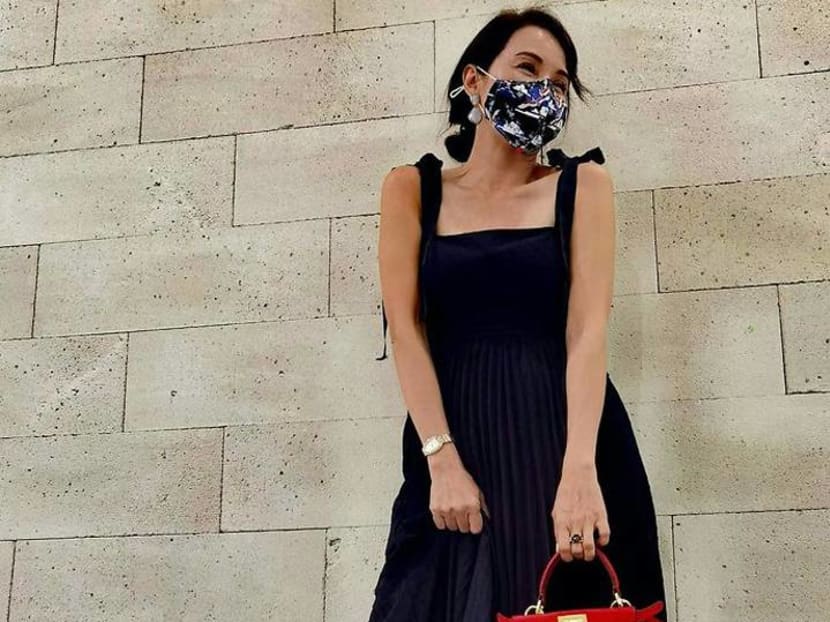 A long flowy black frock never fails to make one look elegant. Case in point: Ah Jie’s pleated and slightly see-through number above. We love that she went the extra mile to style it with a printed face mask and red purse, adding a pop of colour to her getup.