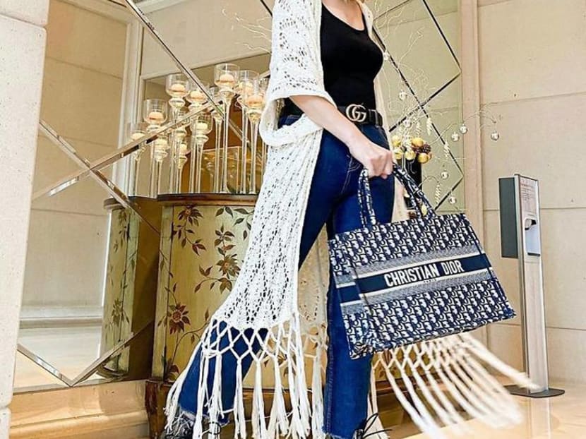 Xiuhuan’s crochet kimono cardigan is a great outerwear option in Singapore — just check out how breathable it looks. We like how she layered it over a simple tank and jeans combo for a weekend-ready getup, and paired it with a designer logo belt and tote for added glam.