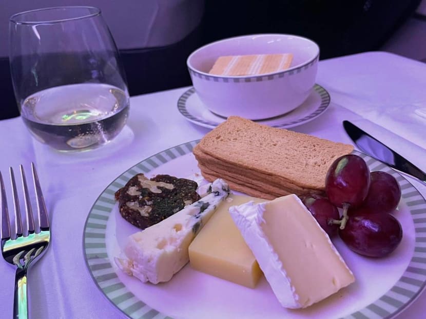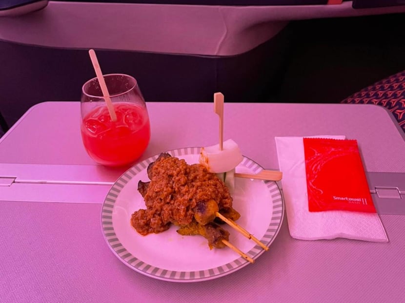 The six-course Business Class meal comprises a satay starter, an appetiser, main course, dessert, and a cheese and fruit platter, as well as drinks (alcoholic and non-alcoholic).