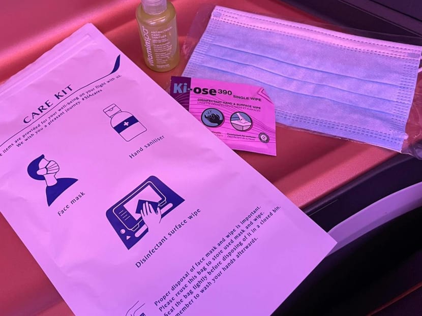 There's a care kit placed at every seat, just like it would be on an actual flight now. Each one comprises antibacterial wipes, hand sanitiser and a disposable mask.