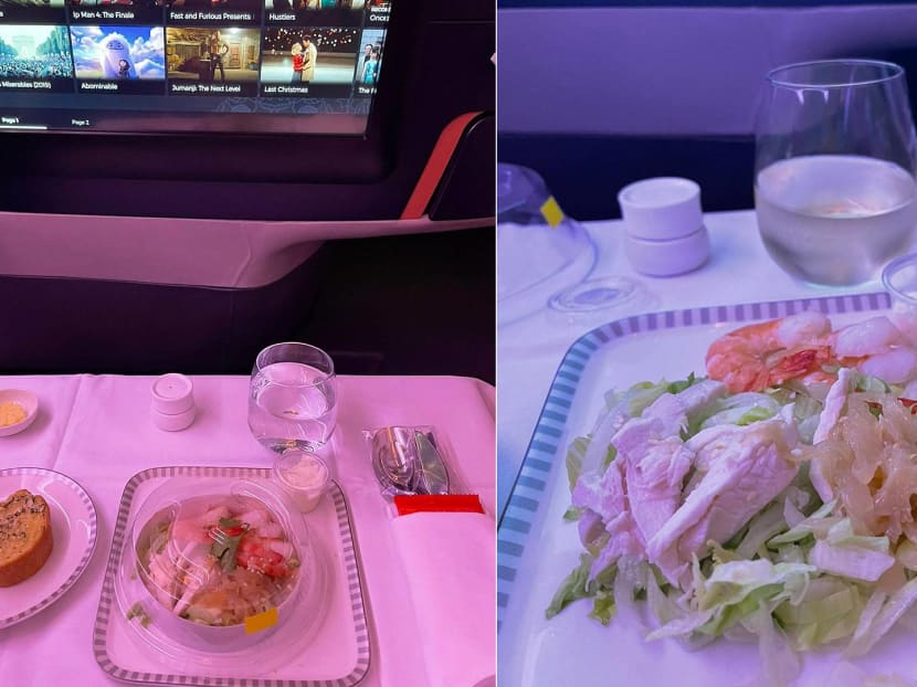 The appetiser was an intentionally retro dish of chicken, prawn and jellyfish salad with coleslaw dressing. It's served with a pandemic-appropriate plastic cover over the dainty porcelain plate (“For hygiene purposes,” the cabin crew cooed.)