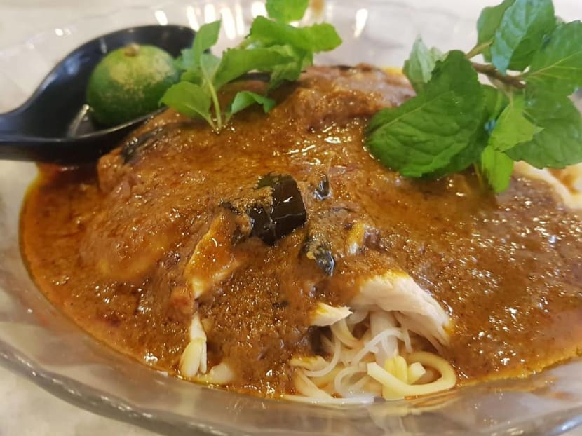 The dry curry noodles are served with shredded chicken, char siew, prawns and an aromatic curry gravy.