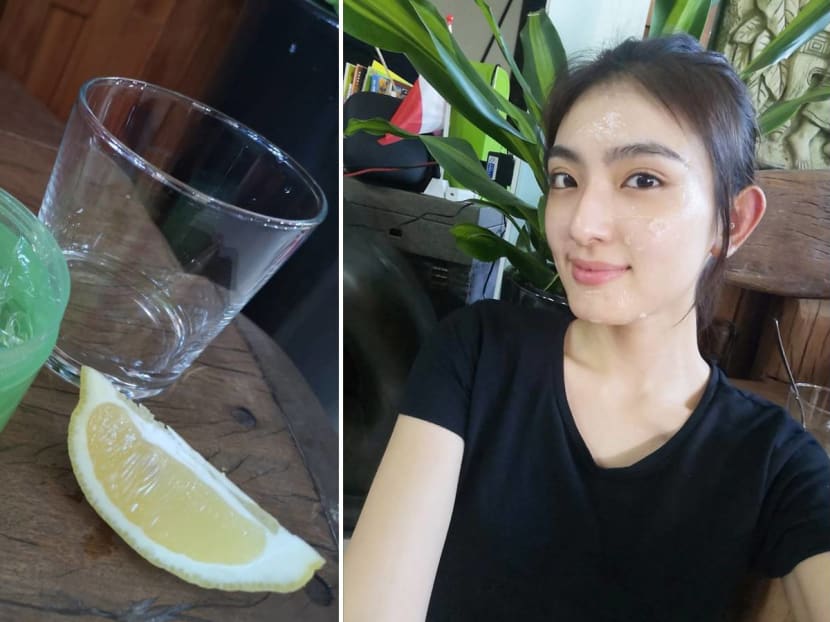 Like Jayley, Hong Ling also looks to lemon to brighten her skin. The actress tells 8days.sg that every week, she exfoliates her skin with fine-grain salt before applying a DIY mask of lemon juice, aloe vera gel, and warm water. “To create the mask, mix two tablespoons of aloe vera gel with a teaspoon each of lemon juice and warm water. I feel salt is good for treating acne so I will use it on my pimples or as an exfoliant before masking,” she says. Leave the mask on for around 15 minutes then rinse it off with warm water.
