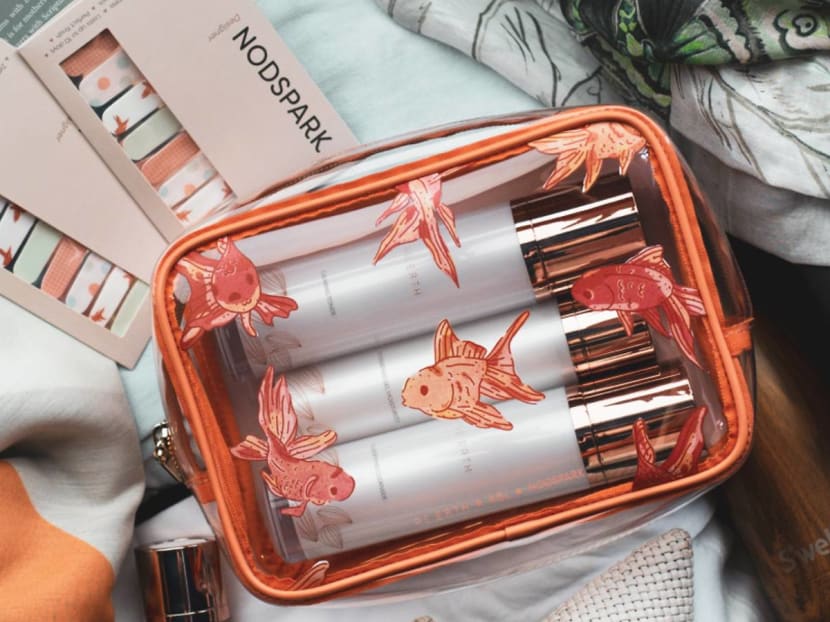 The goldfish design was inspired by Re:erth's Japanese origins (their star ingredient is the Japanese White Turmeric) and the idea of playing goldfish-catching games at Japanese Summer Festivals. Ziling tells 8days.sg, Goldfish promote a kind of mindfulness, as you watch them swimming around, and they're very relaxing to look at. We thought it would be a good idea to put it on a travel pouch, as travel can get hectic and stressful. Adds Eugenia, As you rush around, carrying something that can give you happiness and provide a calming effect is great!
