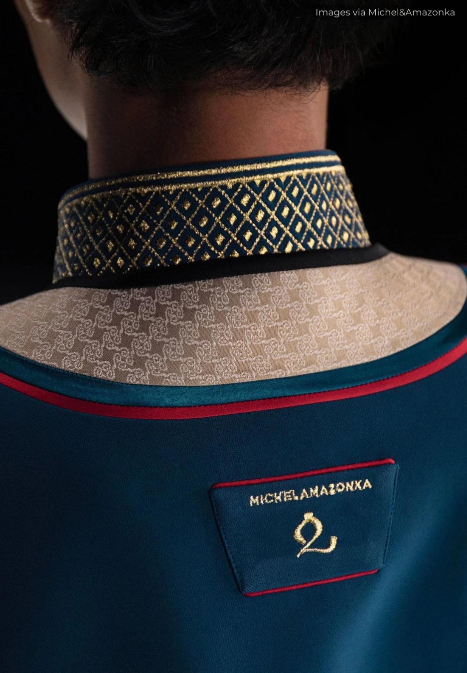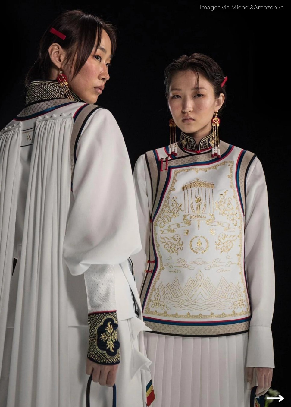 The intricate-looking outfits were designed by upcoming Mongolian fashion brand Michel&Amazonka. The label was founded in 2015 and is headed by three sisters, Michel, Amazonka, and Munkhjargal Choigaalaa who are of Mongolian descent.