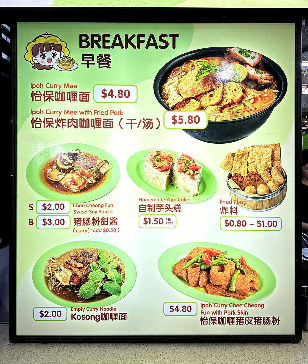 If you want to try the curry mee options, you’d have to head down to the stall early as the curry noodles are only available for breakfast from 7am to 11am. Other dishes on the breakfast menu include homemade Yam Cake ($1.50) and Ipoh Curry Chee Cheong Fun with Pig Skin ($4.80).