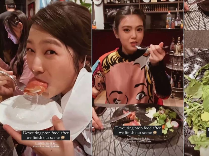 Yummy factor: What better way to conclude a successfully-shot scene than to polish off the edible props themselves? The girls couldn’t be happier to actually get to munch on what looks like parma ham and salad — they must have been hungry!