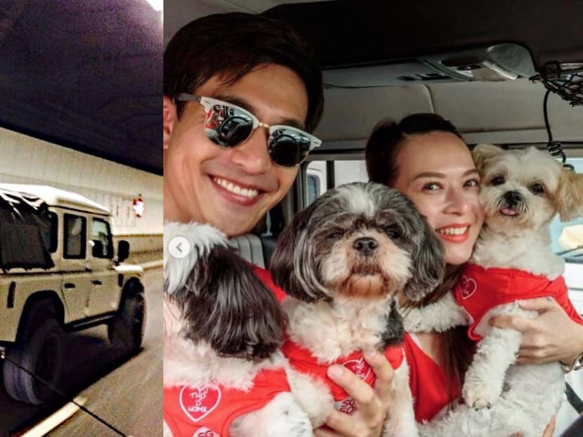 That's one way to make a statement. If the matchy-matchy patriotic outfits on their pooches weren't enough to catch your eye, the huge Singapore flag on Pierre's Land Rover definitely would.