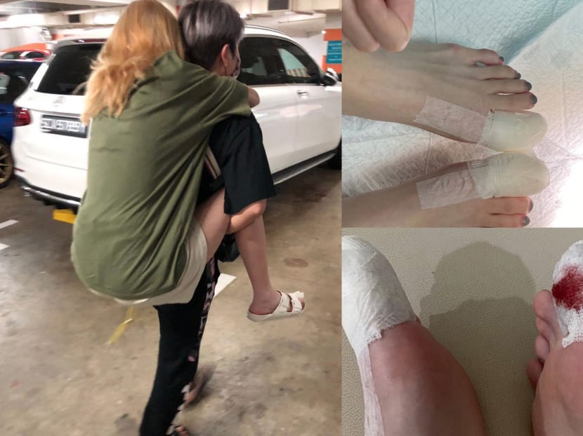 Yup, that's Eleanor Lee, who had surgery on her inflamed ingrown toenails because they were causing her so much pain, getting piggybacked by her mum Quan Yifeng. The Mediacorp host has assured us that Eleanor is recovering well and that she'll be up and walking in no time.