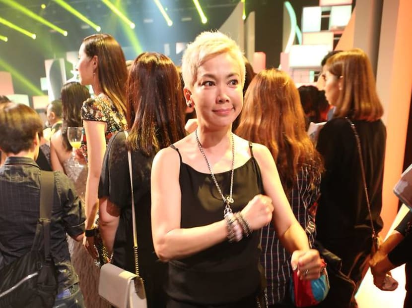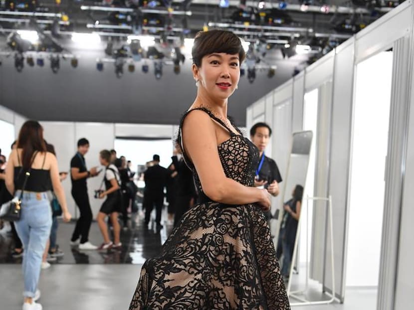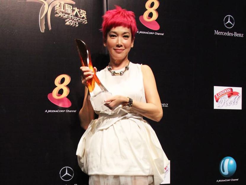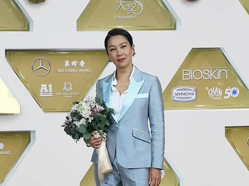 While most female stars opted for gala-worthy gowns for the Star Awards red carpet, Kym bucked the trend and opted for a light blue pantsuit by Q Menswear.