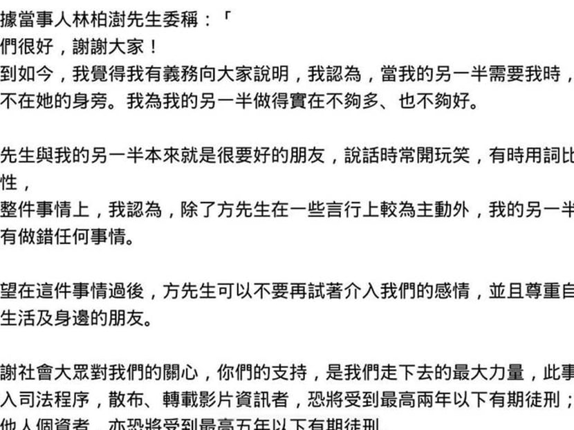Carrie Wong’s Boyfriend Releases Statement: “I Hope Mr Fang Will Stop Coming In Between Our Relationship”