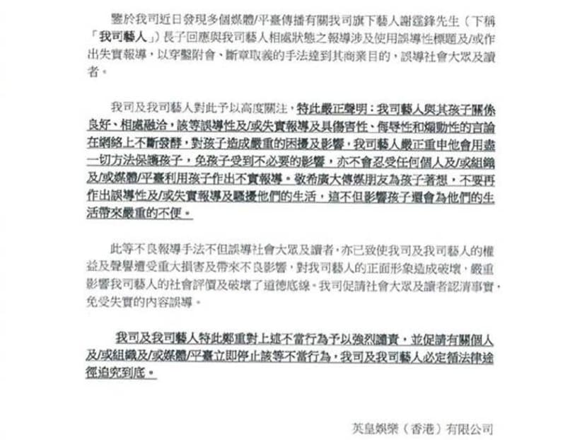 “It has come to our attention that there are media reports using misleading headlines and/or reporting fake news about the relationship of our artiste, Mr Nicholas Tse (hereafter known as ‘our artiste’) and his eldest son.