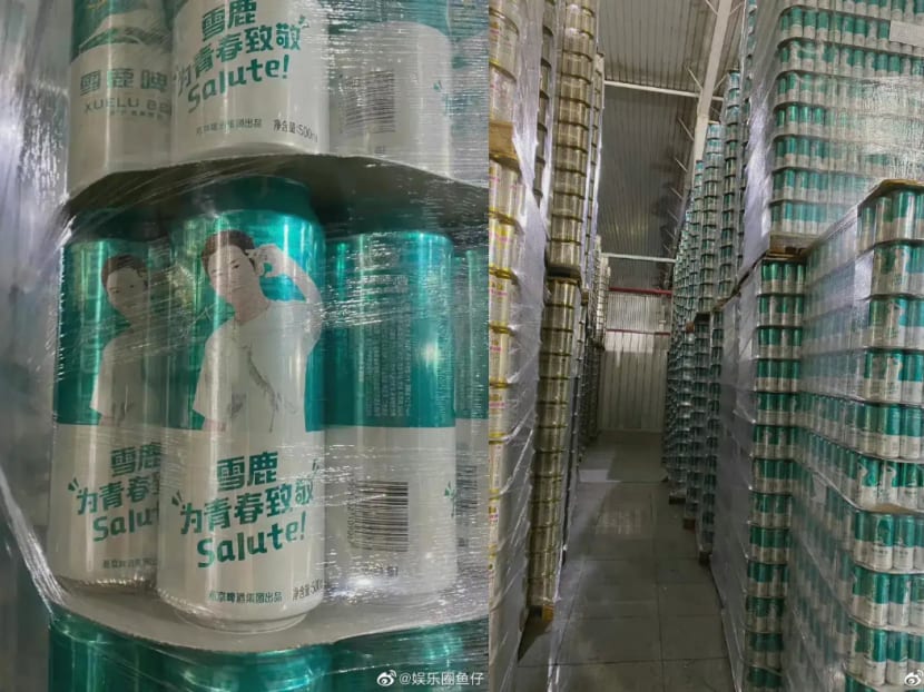 Recently, Weibo users shared pictures of a warehouse packed to the ceiling with cartons of Yanjing Beer, which used to have Zhehan as their celeb ambassador.