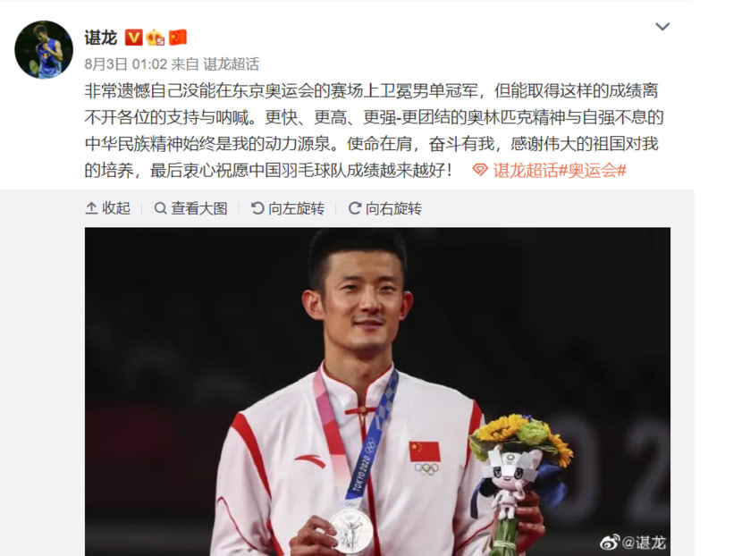 I am very sorry that I failed to defend the men's singles title at the Tokyo Olympics, but I can't achieve this without your support and cheers…. The Olympic spirit and the Chinese spirit of constantly striving for self-improvement have always been the source of my motivation… I am grateful to the motherland for grooming me. Finally, I sincerely wish the Chinese badminton team will achieve more and greater achievements, he wrote.
