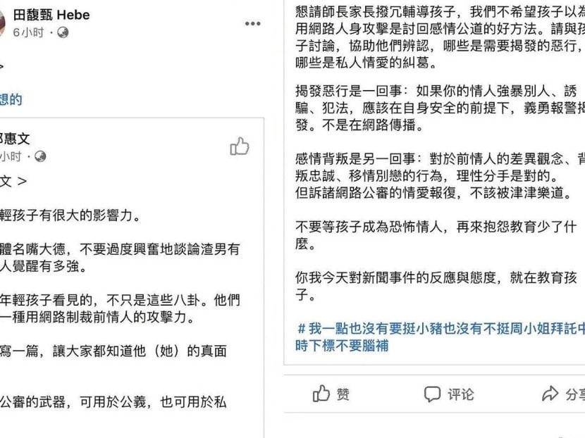 Hebe has also clarified her actions on both Weibo and Facebook, writing, “How can someone who has been hurt in a relationship in the past not emphatise with those who are hurting? When your friends get hurt, they have sisters who will stand up for them and fight to right the injustices that they’ve suffered. However, they also need sisters who can provide an alternative perspective to the situation and calm their impulsive thoughts.”