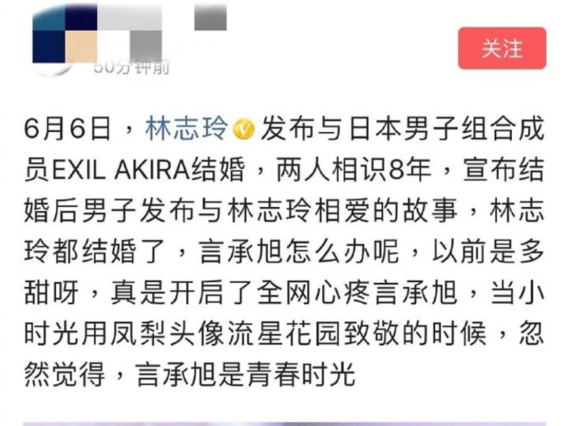 He then uploaded screengrabs of news articles with headlines announcing that he has gotten married to Exile member Akira. (P/S: We know Taiwan recently legalised gay marriage but shouldn't these sites do some fact-checking before uploading their stories?)