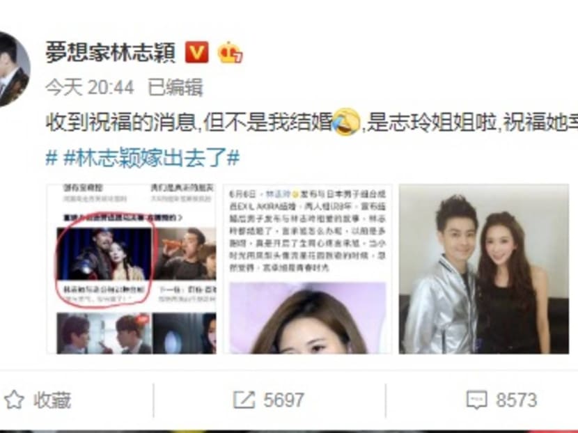 While everyone is busy congratulating Lin Chiling on getting married, Taiwanese pop star Jimmy Lin is also feeling the love. The 44-year-old happily married father-of-three and fast car aficionado posted this message on his Weibo account yesterday (Jun 6): “I’ve received everyone’s well-wishes, but I’m not the one getting married (laughing emoji). It’s Sister Chiling lah. I wish her love and happiness!” He also hashtagged the post with “Lin Chilling married” and “Jimmy Lin got married”.