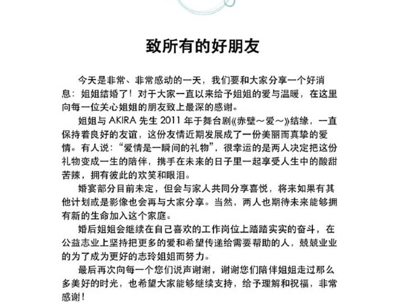 Chiling’s work studio also released a statement announcing the news, adding that the couple has not decided if they are going to throw a wedding banquet.