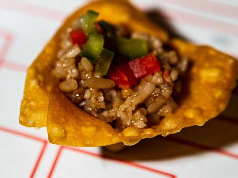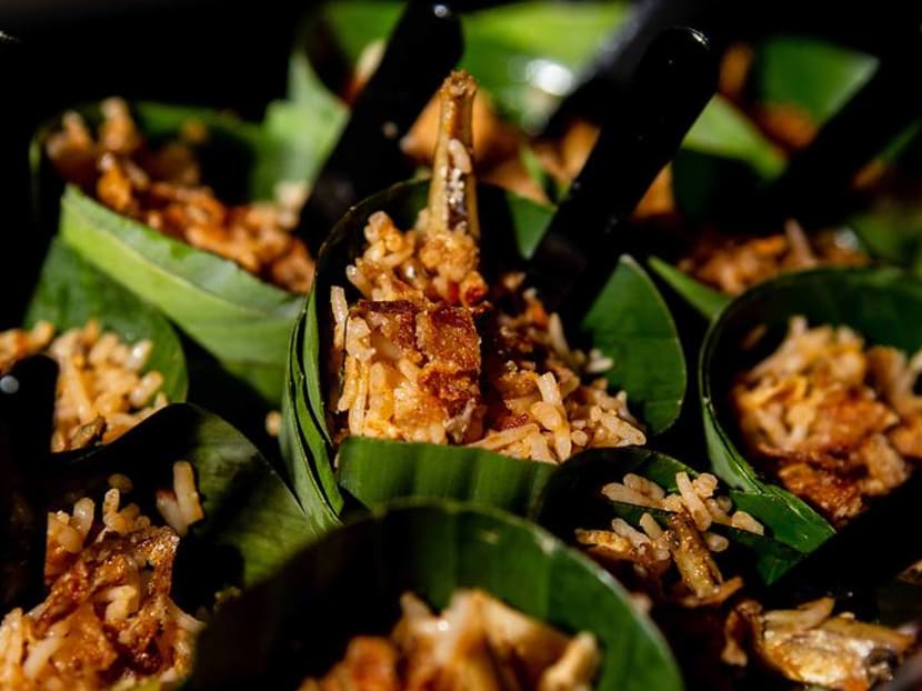 During the party, rice-inspired hors d'oeuvres were served: fried rice with prawns on rice crisp (above); nasi goreng within a banana leaf cone; golden fried rice (salted egg yolk) in mini takeaway boxes; tom yum fried rice topped with quail eggs served on spoons; crab Rangoon with sesame rice cracker; chicken rice ball, mango sticky rice, kueh salat; and customised sake cocktail with lime juice, syrup and cucumber.