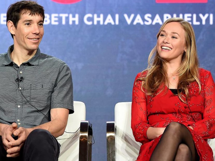 Honnold with girlfriend Sanni McCandless, who is featured in Free Solo, fielding questions at a TCA (Television Critics' Association) panel in LA in February.