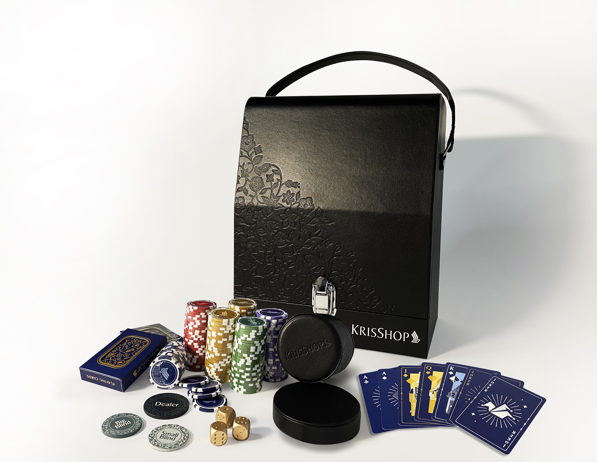 Priced at $318, the exclusive poker set comes encased in a cool, rather retro-looking black leather carrier with batik prints subtly embossed on the front.