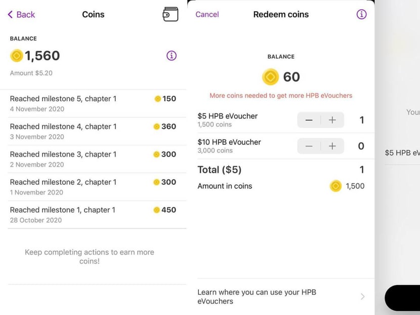 Every 300 coins in the game gives you $1 in HPB eVouchers. You need at least 1,500 coins (or $5) before you can redeem eVouchers, and it's possible to earn up to $380 over two years. You can use the eVouchers at any of the partner merchants (there are currently 46 listed on the site), including Watson’s, Guardian, FairPrice, Giant, Koi, LiHo and Tangs.
