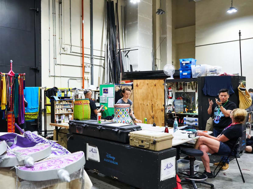 Why is there someone hand painting a Merlion figurine backstage at Aladdin? The man with all the answers and our tour guide for the day, Disney Theatrical Productions production company manager, Matt Henderson explains: “We do a little bit of local flavour everywhere we go. [There’s a scene] where the genie pulls out something from his pocket. In New York, it’s the Statue of Liberty. In Australia, it’s Vegemite.”