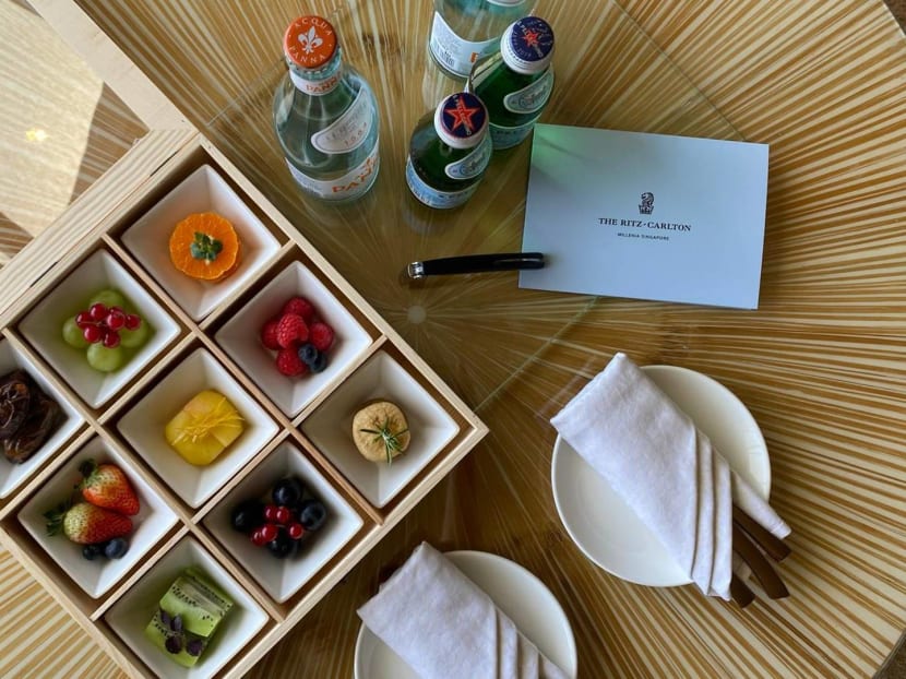 Unusual times call for unusual complimentary amenities in the room. While we had our own masks, we were thankful for the extras provided as guests have to keep masks on while in public spaces in the hotel. And for added safety, besides doing a generic Safe-Entry check-in at the hotel upon arrival, guests are also required to do so at individual facilities throughout the hotel, including the gym, pool and Club Lounge.