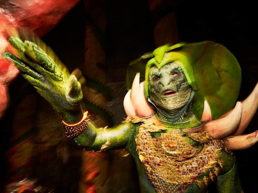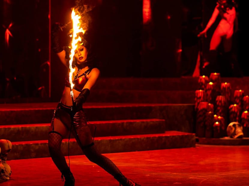 For musical entertainment, there’s a Queen medley with an army of Freddie Mercurys. But the highlight of the half-hour aircon break, we mean, show, is a performance by guest star of the night, the Devil, who’s a woman with a killer bod and some fancy-(hot)pants fire-throwing and sword eating tricks.