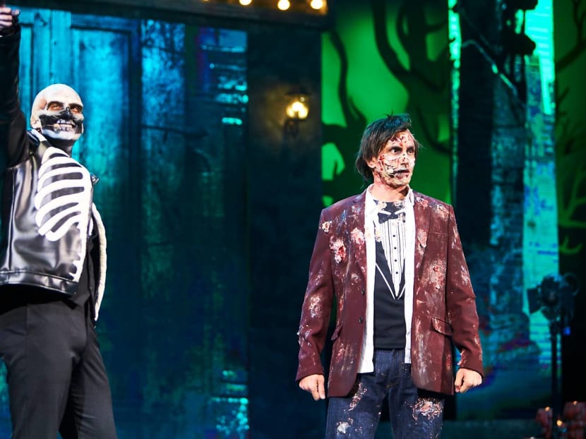 Happening at the Pantages Theatre, this skit is about an undead comedy duo, Skin and Bones, who are filming their hell-arious Saturday Night Live-esque talkshow that has more than a few mishaps. Providing comic relief is a Mariah Scary and Hairiana Grande face-off at the 666th Grimmy Awards (gotta love these punny names).