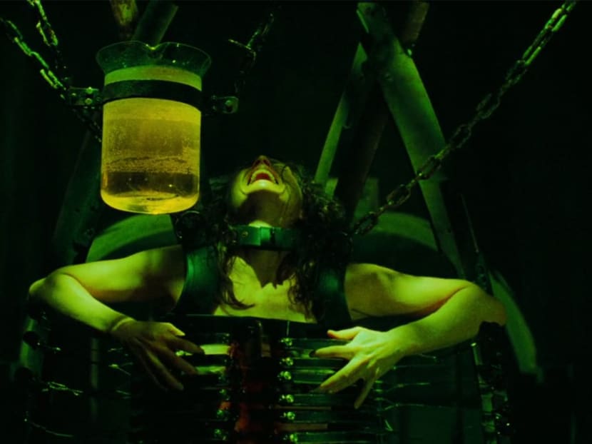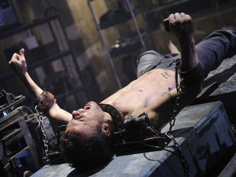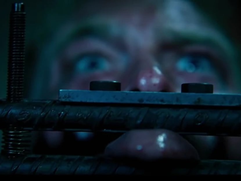 As seen in Spiral (2021). This reminds us of the ‘Ten Courts of Hell’ exhibit at Haw Par Villa. The victim, standing on a stepladder with his hands tied with barbed wire, is strung up by his tongue in the middle of a subway tunnel. Oh yeah, a train is heading his way. To avoid getting atomised by the train, he has to first rip out his own tongue. Decisions, decisions.
