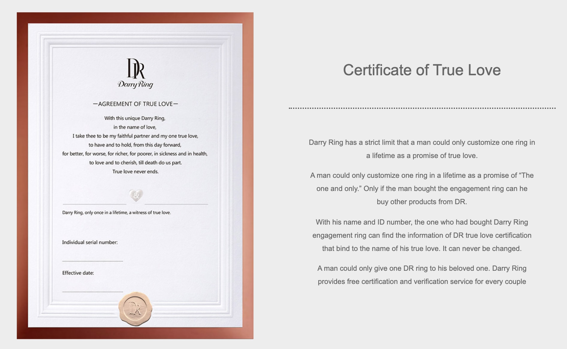 Darry Ring markets their engagement rings as a once in a lifetime gift, and requires buyers to register their name and ID number at the point of purchase.