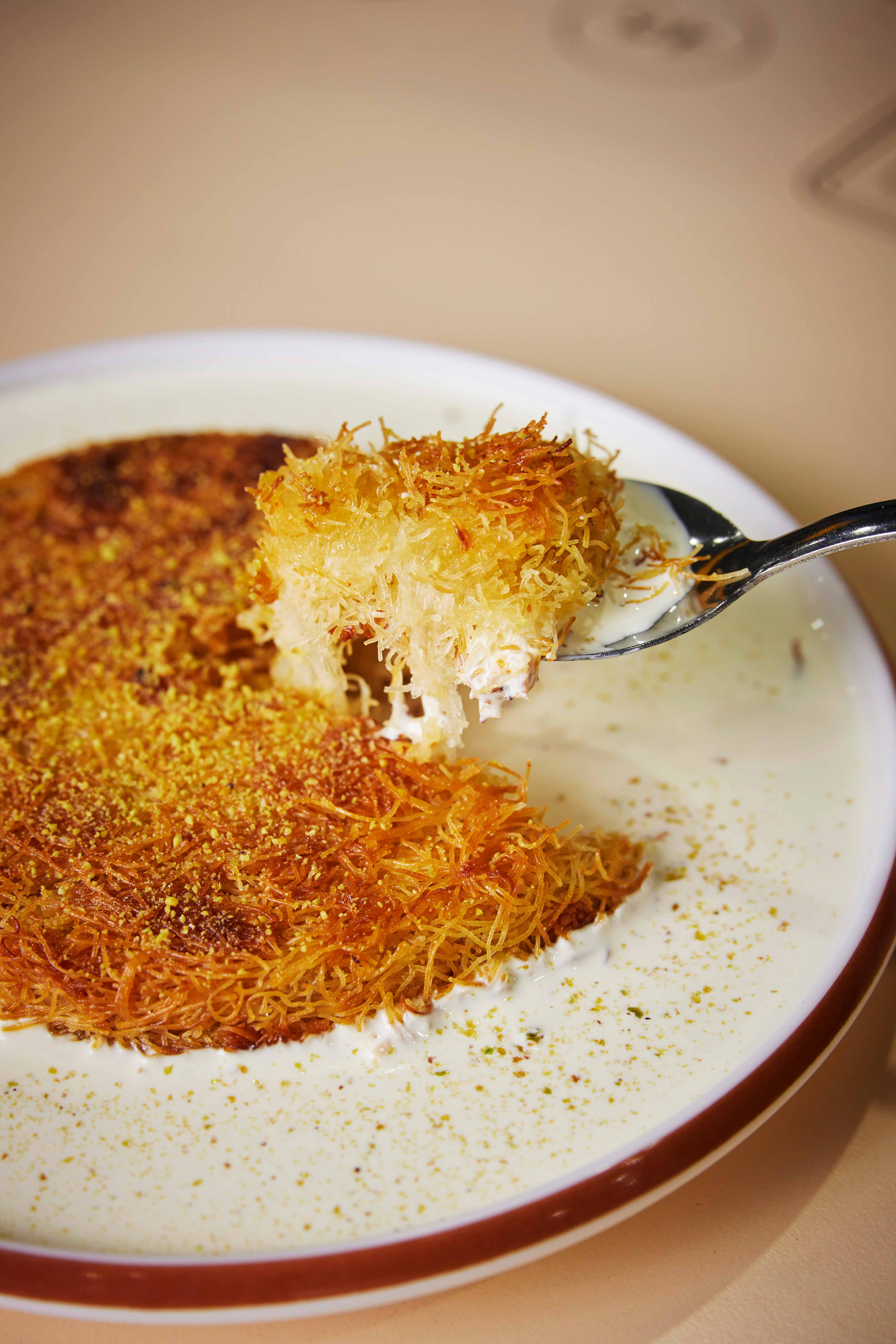 A sweet cheesy dessert covered in crispy shredded filo pastry that’s said to have originated from Hatay, a province in Antakya city in Turkey. Its cheese filling is often mixed with grated pistachios, but Fatih says he makes his with just butter and sugar syrup.
