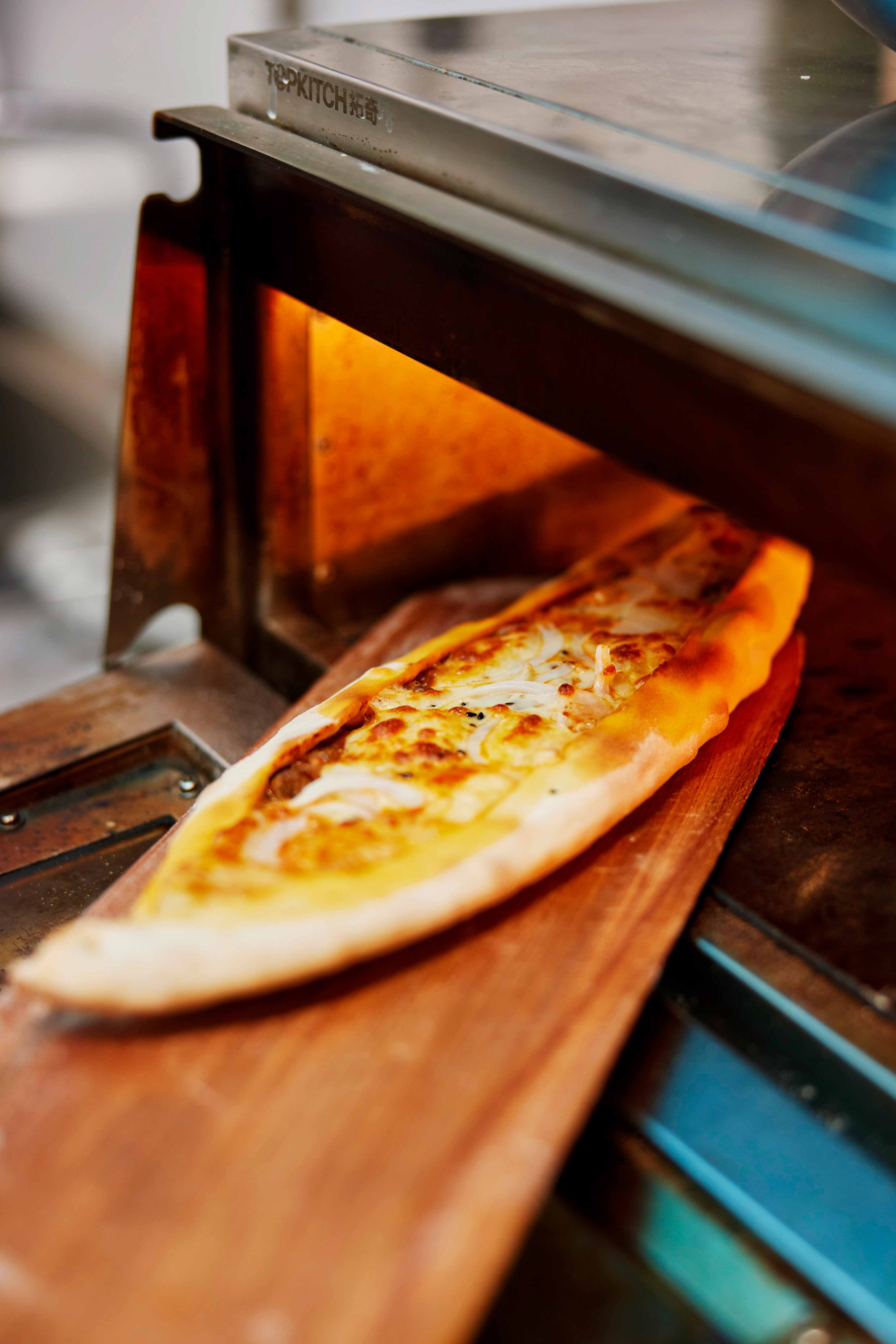 This boat-shaped Turkish ‘pizza’ looks quite appetising, with oozy cheese, shredded lamb and a lightly charred golden-brown crust.
