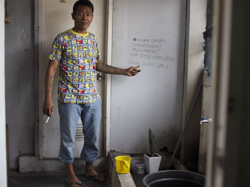 The 48-year-old’s rooftop “cell” heats up like an oven in the day. Sometimes, fights break out with noisy neighbours as the walls are porous. And the common toilet and bath area he shares with the other tenants — including a couple with a young child — is so often choked that he had inscribed a warning in Bahasa Indonesia on the wall that says : “Don’t litter because if it is clogged, we will all be flooded. Be a little smart, okay?”