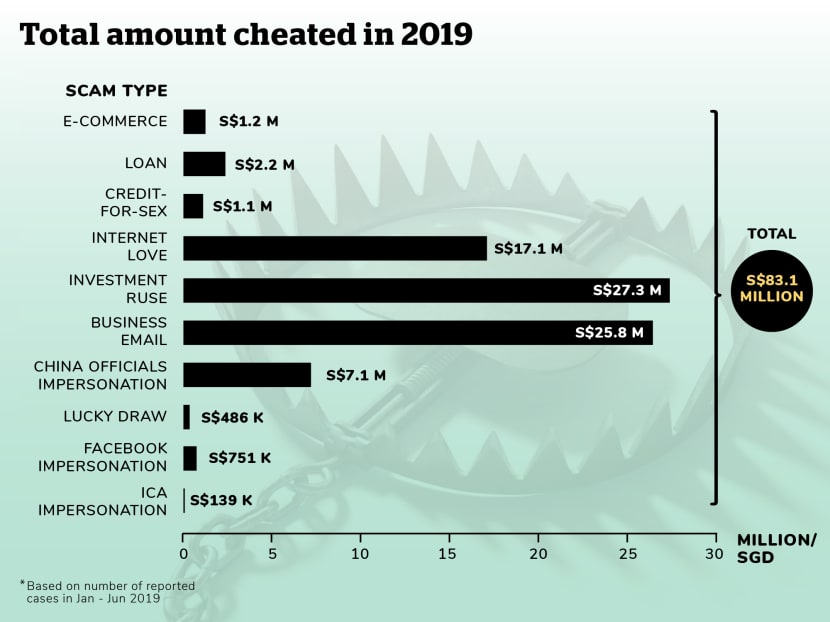 The numbers are staggering. For the top 10 types of scams from January to June this year, 3,591 cases were reported with a total loss of S$83.1 million. The largest sum cheated in a single case this year was S$4.3 million, via an investment ruse.