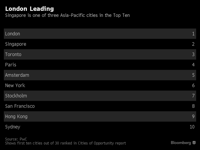 The Asian island nation ranks behind London as the best global city, PricewaterhouseCoopers LLP said in a new study, based on social and economic data published before the UK voted to leave the European Union. The Cities of Opportunity Index places Singapore ahead of Paris and Amsterdam, two European cities that are seeking to attract foreign businesses if they decide to shift jobs out of London.