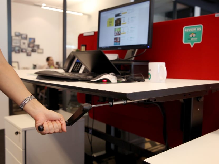 SINGAPORE – At the Singapore office of travel company TripAdvisor, all 180 desks are height-adjustable and staff may opt to stand, sit or use a gym ball while working.