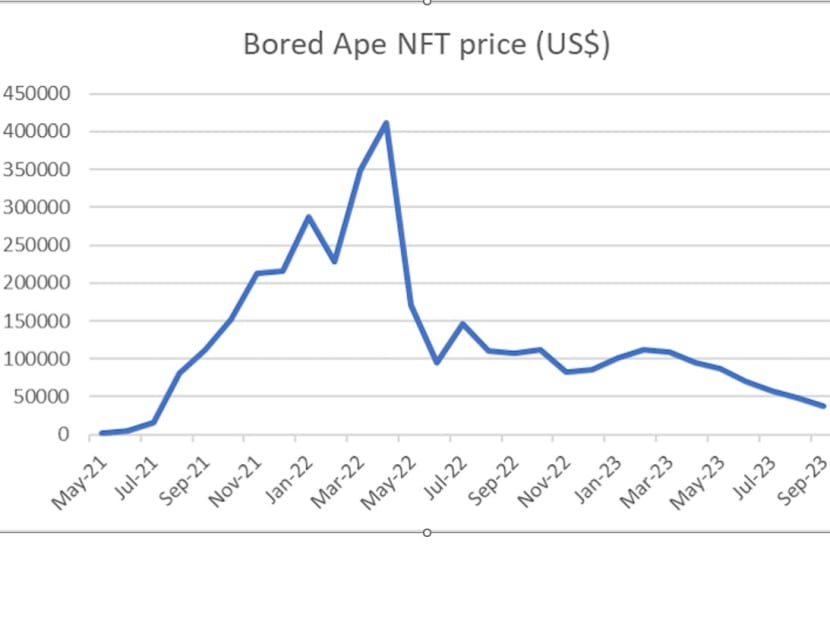 Prices in the NFT market have also seen huge falls. The prices of Bored Ape NFTs are down about 90 per cent from their peak. The CryptoPunks have done slightly better by losing only 80 per cent.
