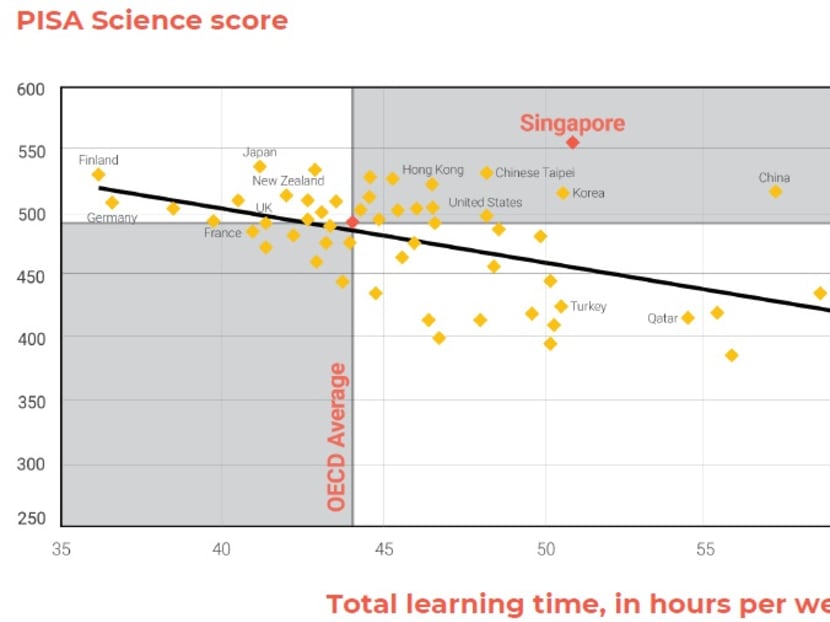 Fortunately, if you look at the red dot which is Singapore, we are an outlier – our students study more than their peers in many other countries but we score exceptionally well, which is the Singapore DNA.