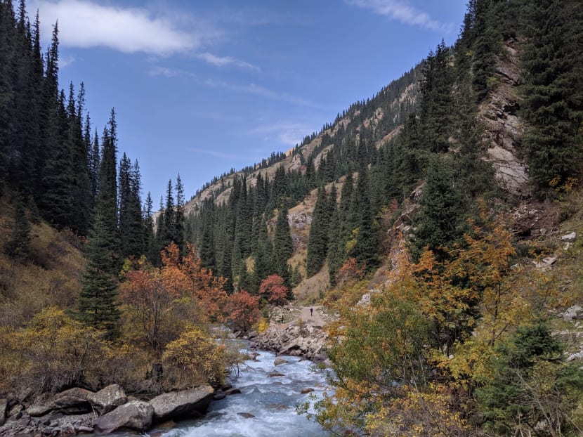But with the hillsides of the mountain pastures forming an uneven outline across clear blue skies everywhere you turn, pine trees lining along its rivers which flow with crystal clear waters, and tree leaves in vibrant autumn colours of gold, red and orange — I wouldn’t be surprised if Kyrgyzstan is even more stunning than Switzerland itself.