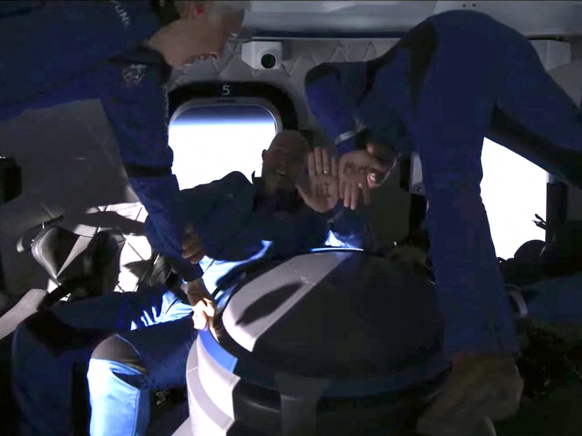 Sir Richard Branson speaks after flying into space aboard a Virgin Galactic vessel at Spaceport America near Truth and Consequences in New Mexico, US on July 11, 2021 (left). Mr Jeff Bezos speaks about his flight on Blue Origin’s New Shepard into space during a press conference on July 20, 2021 in Van Horn, Texas, US (right).