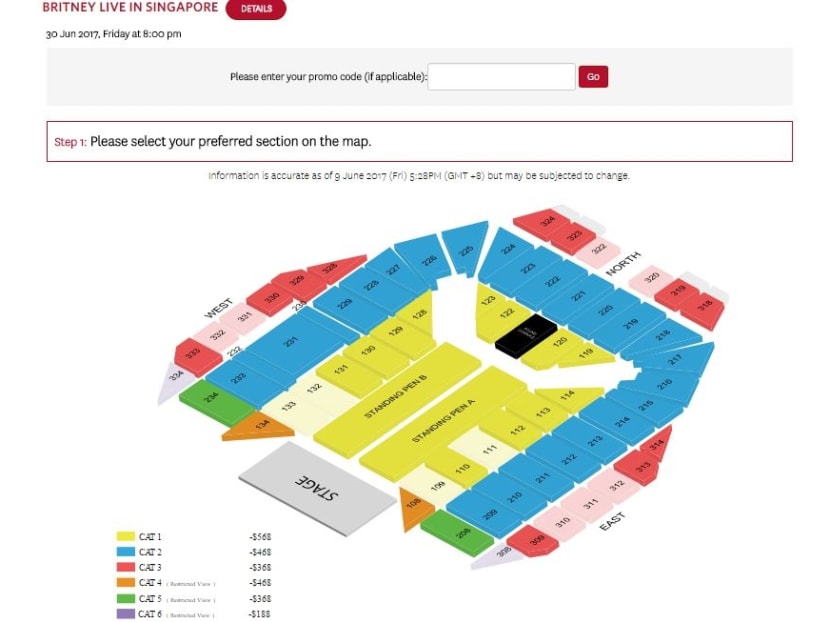 A ticket costing S$188 for Category 6 has a restricted view, and so do tickets in Categories 4 and 5. This means, Wee said, fans have to fork out quite a bit of cash to get a view of Spears.