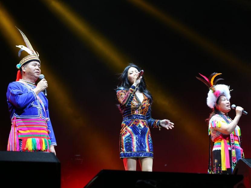 She also celebrated her tribal heritage by bringing her parents onstage. A-Lin's parents were clad in the colourful costumes and head dresses of the Amis people. The Amis are the largest ethnic group among the Taiwanese aboriginal people, and A-Lin - who is married to Taiwanese baseball player Huang Kan Lin - has always been proud of her tribal history.