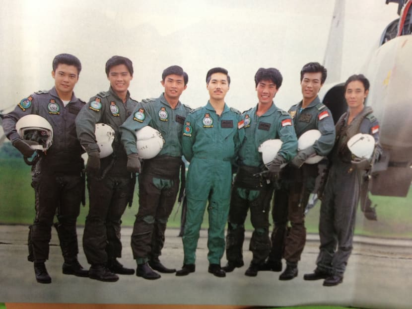 (Click to enlarge) Old-school Chen Tianwen with pals in the 1988 Channel 8 series Air Force. L-R: Wang Yuqing, Li Nanxing, Chen Tianwen, Li Wenhai, Edmund Chen, Zheng Geping and Lin Ming Zhe.