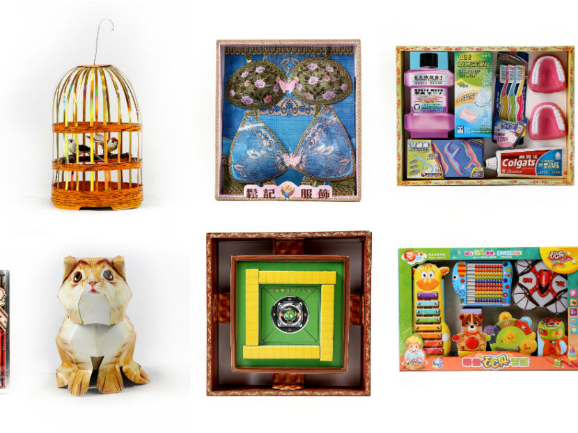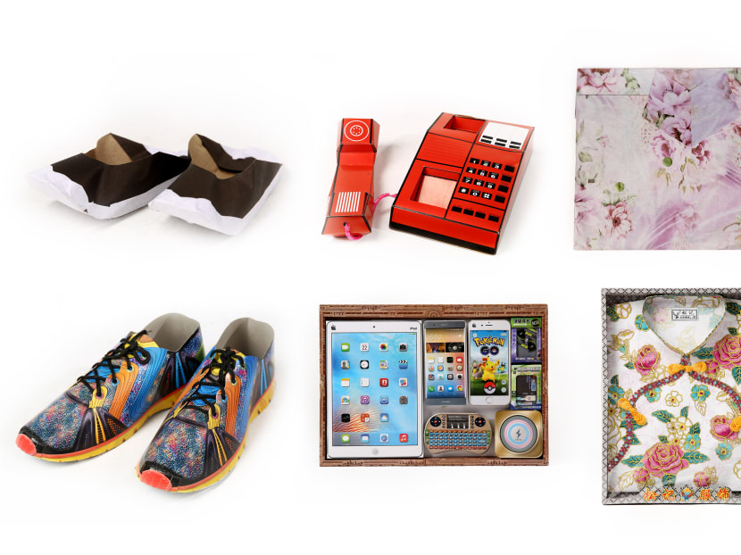 (The top row shows the old versions of different paper offerings; while the bottom row shows the updated versions of these items, such as (from left to right) shoes, telephones and clothes. Photo: Nuria Ling/TODAY)