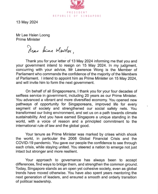 - Prime Minister Lee Hsien Loong has informed President Tharman Shanmugaratnam that he and his Government intend to resign on Wednesday (May 15)
