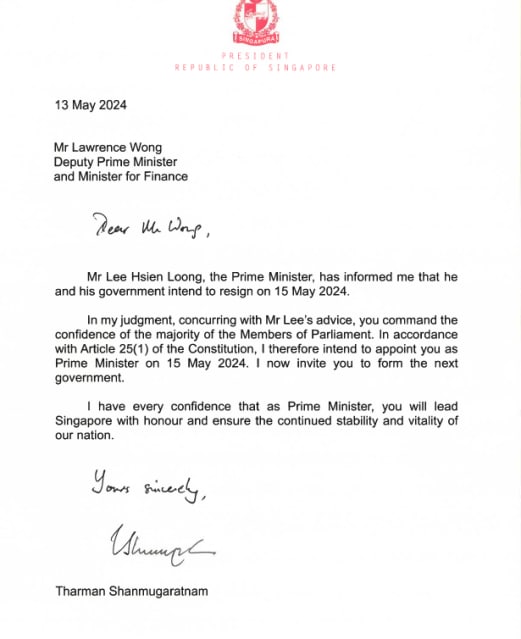 Mr Tharman also noted in his letter that Mr Wong intends to appoint Mr Lee as Senior Minister moving forward.